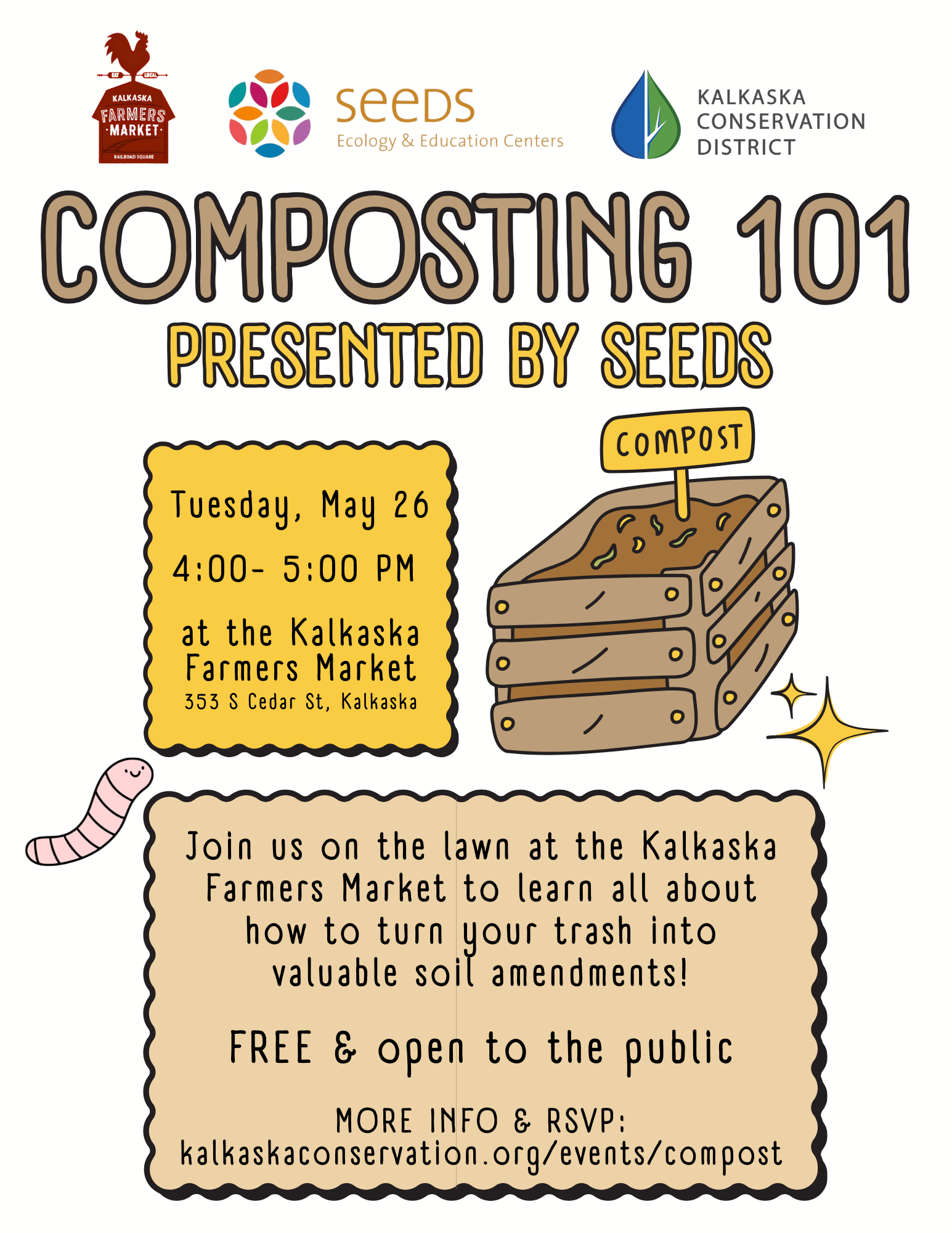 On Tuesday, May 26, 2026, from 4-5 PM, SEEDS will be presenting “Composting 101” on the lawn at the Kalkaska Farmers Market, located at Railroad Square Pavilion (353 S Cedar St, Kalkaska).
