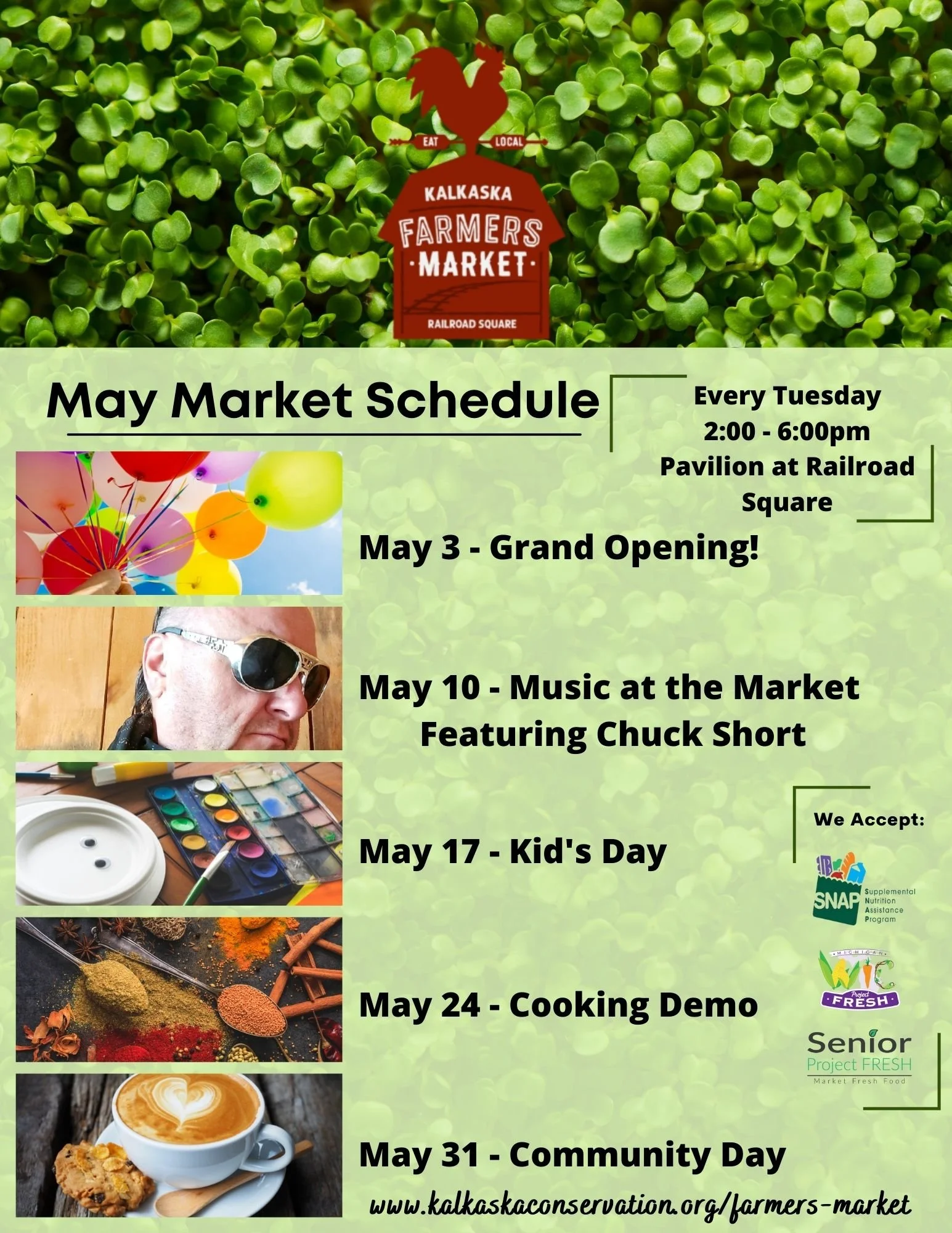 The second Tuesday of the month will feature ‘Music at the Market’. On May 10 the KCD will feature local artist Chuck Short for the Market duration. Music will take place at the north end of the Pavilion and be complete with picnic tables on the lawn nearby for all to enjoy.